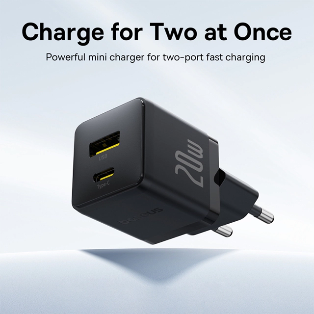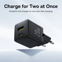 با شارژر دیواری بیسوس 20 وات می‌توانید دو دستگاه را همزمان شارژ کنید؛ مثلاً گوشی و هندزفری یا ساعت هوشمند. فناوری هوشمند داخلی، جریان برق را به طور خودکار بین دستگاه‌ها تقسیم می‌کند تا شارژ ایمن و پایدار انجام شود.